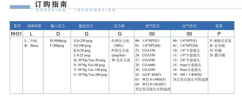 產品說明: P31不銹鋼雙極減壓閥,雙級式膜片減壓結構,輸出壓力穩定,適用于高純氣體、標準氣體、腐蝕性氣體等。